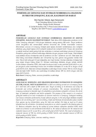 Syaeful, Heri and Suharji, suharji and Sumaryanto, Agus (2014) Pemodelan Geologi dan Estimasi Sumberdaya Uranium Di Sektor Lemajung, Kalan, Kalimantan Barat. In: Seminar Nasional Teknologi Energi Nuklir 2014, 19 Juni 2014, Pontianak.