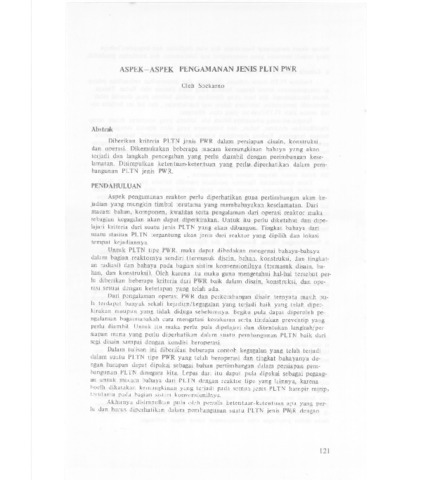 Diberikan kriteria PLTN jenis PWR dalam persiapan disain, konstruksi, dan operasi. Dikemukakan beberapa macam kemungkinan bahaya yang akan terjadi dan langkah pencegahan yang perlu diambil dengan perimbangan keselamatan. Disimpulkan ketentuan-ketentuan yang perlu diperhatikan dalam pembangunan PLTN jenis PWR.