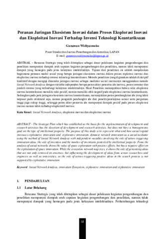 Rencana Startegis yang telah ditetapkan sebagai dasar pelaksaan kegiatan pengembangan dan penelitian mempunyai dampak arah capaian kegiatan pengembangan dan penelitian, namun tidak mempunyai dampak yang homogen pada jenis kekayaan intelektualnya. Tujuan dari penelitian ini adalah menjelaskan bagaimana peranan modal sosial yang berupa jaringan ekosistem inovasi dalam proses esplorasi inovasi dan eksploitasi inovasi terhadap invensi teknologi keantariksaan. Metode penelitian yang digunakan adalah diskriptif kualitatif dengan menguji dinamika jaringan inovasi sebagai mediator social inovasinya menggunakan metode Social Network Analysis dengan variable independen berupa peran aktor pencetus ide inovasi, peran inventor dan