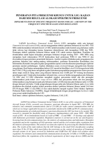 Sunar and Iwan Nofi Yono P and Gunawan S.P (2017) Penerapan Pita Frekuensi Khusus Untuk LSU: Kajian Dari Sisi Regulasi Alokasi Spektrum Frekuensi. Prosiding SIPTEKGAN XXI-2017 Seminar Nasional Iptek Penerbangan & Antariksa XXI Tahun 2017. pp. 67-81. ISSN 978-602-71833-3-9