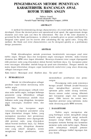 Telah dikembangkan metode penentuan karakteristik rancangan awal rotor turbin angin. Dengan daya dan kecepatan angin rancangan tertentu, maka kisaran diameter dan RPM rotor dapat diketahui. Besarnya diameter rotor sangat dipengaruhi oleh prestasi sudu yang dinyatakan dalam bentuk koefisien daya, Cp, kecepatan putar rotor rancangan diketahui setelah harga tip speed ratio ditentukan. Dengan metode ini mak a dapat ditentukan dengan cepat karakteristik sudu/roto r yang aka n dirancang, sebagai rancangan awal.