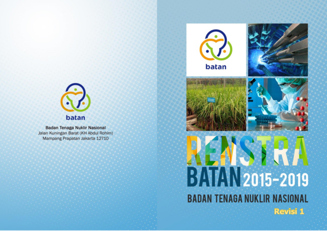 Rencana Strategis Badan Tenaga Nuklir Nasional (Renstra BATAN) Tahun 2015-2019 memuat penetapan visi, misi, tujuan, sasaran strategis dan strategi yang dijabarkan dalam kebijakan dan program serta indikator keberhasilan yang diselaraskan dengan sasaran, agenda dan misi pembangunan serta visi Presiden, sebagaimana diamanatkan pada Rencana Pembangunan Jangka Menengah Nasional (RPJMN) Tahun 2015-2019 yang telah ditetapkan dengan Peraturan Presiden Nomor 2 Tahun 2015. Renstra BATAN Tahun 2015-2019 ditetapkan dalam jangka waktu lima tahunan dan disusun antara lain berdasarkan hasil evaluasi terhadap pelaksanaan Renstra BATAN periode tahun 2010-2014, identifikasi analisis lingkungan strategis yang melibatkan pemangku kepentingan, Pemimpin dan Unit Kerja BATAN. Renstra BATAN dapat dikatakan sebagai suatu proses partisipatif, sistematis dan berkelanjutan dalam rangka pencapaian visi, misi, tujuan dan sasaran BATAN. Berdasarkan review Renstra BATAN Tahun 2015-2019 pada tahun 2016, terdapat beberapa perubahan target kinerja BATAN karena penghematan dan pemotongan/efisiensi anggaran tahun 2016 dan alokasi anggaran BATAN tahun 2017, serta adanya beberapa penyempurnaan rumusan sasaran maupun indikator kinerja sesuai masukan dari berbagai pihak. Oleh karena itu, Renstra BATAN Tahun 2015-2019 perlu direvisi agar perencanaan dan pelaksanaan program dan kegiatan BATAN lebih optimal. Peraturan Kepala BATAN Nomor 6 Tahun 2017 tanggal 22 Maret 2017 tentang Perubahan atas Peraturan Kepala BATAN Nomor 5 Tahun 2015 tentang Rencana Strategis BATAN Tahun 2015-2019 merupakan dasar hukum penetapan Renstra BATAN Tahun 2015-2019 Revisi 1, untuk dipergunakan sepenuhnya sebagai bahan acuan bagi Unit Kerja dan Deputi/Sestama dalam menetapkan arah kebijakan perencanaan program, penyusunan rencana kerja, perjanjian kinerja, pelaksanaan program dan kegiatan serta evaluasi kinerja BATAN.