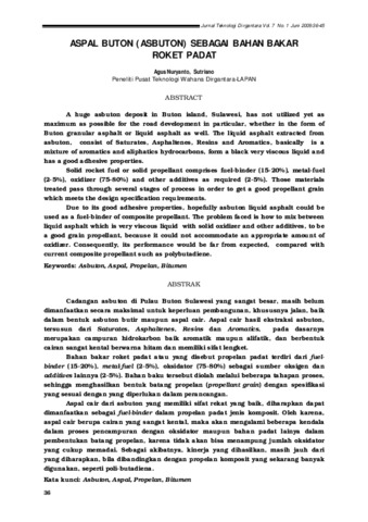 Agus Nuryanto (2009) Aspal Buton (Asbuton) Sebagai Bahan Bakar Roket Padat. Jurnal Teknologi Dirgantara, 7 (1). pp. 36-45. ISSN 1412-8063