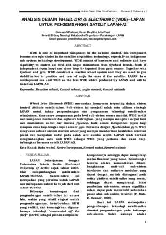 Wheel Drive Electronic (WDE) merupakan komponen terpenting dalam sistem kontrol Attitude satelit -mikro. Sub-sistem ini menjadi salah satu pilihan strategis LAPAN untuk tahap pengembangan dan penguasaan teknologi satelit-mikro selanjutnya , khususnya penguasa an pada level sub-sistem secara mandiri. WDE terdiri dari komponen hardware dan software terintegrasi, yang mampu mengatur output torsi dan momentum sudut dari inersia flywheel , baik secara independen ( open loop ) maupun close loop dengan input sensor gyro . Bersama dengan flywheel dan gyro , WDE menyusun sebuah si stem reaction wheel yang mampu memberikan kestabilan orientasi posisi dan kecepatan sudut pada salah satu sumbu satelit. LAPAN telah berhasil mengembangkan satu unit WDE sebagai WDE yang pertama dan akan diuji- terbangkan bersama satelit LAPAN -A2.