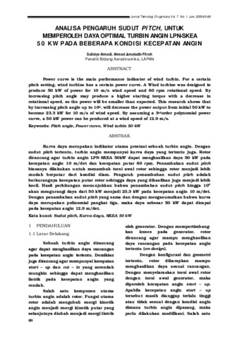 Sulistyo Atmadi (2009) Analisa Pengaruh Sudut Pitch, Untuk Memperoleh Daya Optimal Turbin Angin LPN-SKEA 50 KW Pada Beberapa Kondisi Kecepatan Angin. Jurnal Teknologi Dirgantara, 7 (1). pp. 60-66. ISSN 1412-8063