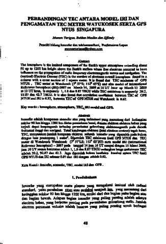 Ionosfer adalah komponen atmosfer atas yang terionisasi yang merentang dari ketinggian sekitar 90 km hingga 1200 km diatas permukasn bumi, dimana elektron elektron bebas yang terjadi dapat berpengaruh terhadap perambatan gelombang elektromagnetik pada daerah frekuensi tinggi dan navigasi. Total kandungan elektron (total electron content) tegak lurus, TEC, menyatakan jumlah kerapatan elektron seluruh ionosfer yang diperoleh pada kolom dengan luas penampang 1 meter2. Diperoleh TEC minimum basil GPS NTUS dan TEC meter di Watukosek Watukosek (7° 57'LS; 112° 65'BT) serta model nu (International Reference Ionosphere) — 2007 pada tanggal 14 jam 16 UT sampai dengan 15 Maret 2009, jam 10 UT secara berurutan adalah 1, 1.8 dan 8.87 TECU sedangkan harga maksimum TEC adalah 39.2, 92.87 dan 42.7. Juga diperoleh bahwa koefisien korelasi antara TEC basil GPS NTUS dan IRI sebesar 0.87 dan IRI dengan adalah 0.62.