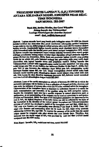 Lapisan atmosfer bumi yang berada pada ketinggian antara 50-1000 km dimana molekul-molekul dan atom-atom akan pecah membentuk sekumpulan partikel bermuatan berupa elektron dan ion alcilmit pengaruh radiasi extreme ultra violet (EUV) matahari disebut lapisan ionosfer. Karakteristik lapisan ionosfer penting untuk dipahami karena bermanfaat untuk komunikasi radio dan koreksi posisi pada sistem navigasi menggunakan GPS. Selain itu lapisan ionosfer juga mempunyai respon tertentu terhadap fenomena alam seperti gempa sehingga pemahaman tentang respon tersebut dapat digunakan sebagai prekursor kejadian gempa (Pulinet dan Boyarchuk, 2004). Salah satu parameter lapisan ionosfer yang penting dalam hal ini adalah foF2 yaitu frekuensi tertinggi dari gelombang radio yang masih dapat dipantulkan oleh lapisan ionosfer dalam arah penjalaran vertikal. Bidang Ionosfer dan Telekomnnikasi LAPAN telah mengembangkan model ionosfer mendekati real time yang sudah berupa peta TEC di atas Sumatra dan sekitarnya (Buldan M dan Septi P , 2009). Dan peta TEC di atas Sumatera dan sekitamya dapat dibuat peta foF2 menggunakan model hubungan kuadrat antara foF2 dan TEC. Untuk meningkatkan akurasi model maka hasil keluaran model tersebut perlu dibandingkan dengan model lainnya yang sudah lebih dulu ada. Oleh karena itu akan dianalisis bagaimana parameter foF2 keluaran model mendekati real time LAPAN dibandingkan dengan model IRI-2007.