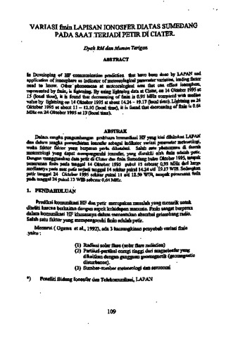 Dalam rangka pengembangan prakiraan kommikasi HF yang kini dilakukan LAPAN dan dalam rangka pemanfaatan ionosfer sebagai indicator variasi parameter meteorologi, maka faktor faktor yang berperan perlu diketahui. Salah satu phenomena di daerah meteorologi yang dapat mempengaruhi ionosfer, yang diwakili oleh fmin adalah petir. Dengan menggunakan data petir di Ciater dan fmin Sumedang bulan Oktober 1995, tampak penurunan fmin pada tanggal 14 Oktober 1995 pukul 15 sebesar 0,95 MHz dari harga mediannya pada seat petir terjadi tanggal 14 sekitar pukul 14.24 s/d 19.17 WIB. Sedangkan petir tanggal 24 Oktober 1995 sekitar pukul 11 s/d 12.50 WIB, tampak 'penurunan fmin pada tanggal 24 pukul 13 WIB sebesar 0,64 MHz.