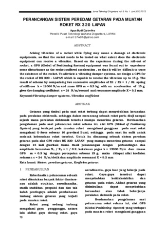 Getaran yang timbul pada saat roket terbang dapat menyebabkan kerusakan pada peralatan elektronik, sehingga dalam merancang sebuah roket perlu diuji sampai sejauh mana peralatan elektronik tersebut mampu menerima getaran. Berdasarkan pengalaman pada saat peluncuran roket selama ini, alat GPS ( Global of Positioning System ) yang terdapat pada muatan roket mengalami gangguan pada saat roket mengalami G -force sebesar 10 gravitasi B umi, sehingga pada saat itu sulit untuk melacak keberadaan roket tersebut. Untuk itu dirancang sebuah sist em peredam getaran pada alat GPS roket RX 320 -LAPAN yang mampu me nerima getaran sampai dengan 15 kali gravitasi B umi. Hasil perancangan dengan perbandingan dua amplitudo berurutan X 1 / X 2 = 1 / 0.2, kekakuan pegas k = 120 00 N/m dan massa GPS m = 0 .3 kg dengan percepatan sebesar 15 g, maka didapat nilai koef isien redaman c = 24 N/m/detik dan amplitude resonansi X = 9.2 mm