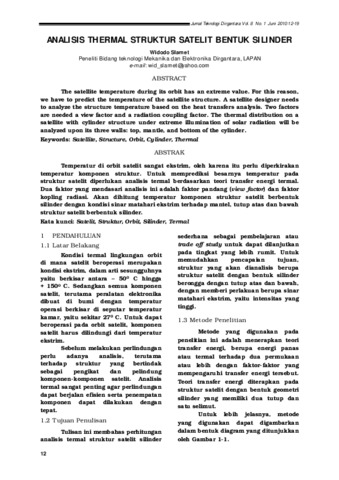 Widodo Slamet (2010) Analisis Thermal Struktur Satelit Bentuk Silinder. Jurnal Teknologi Dirgantara, 8 (1). pp. 12-19. ISSN 1412-8063
