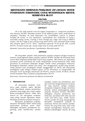 Anita Pinalia (2011) Kristalisasi Ammonium Perklorat (AP) Dengan Sistem Pendinginan Terkontrol Untuk Menghasilkan Kristal Berbentuk Bulat. Jurnal Teknologi Dirgantara, 9 (2). pp. 124-131. ISSN 1412-8063