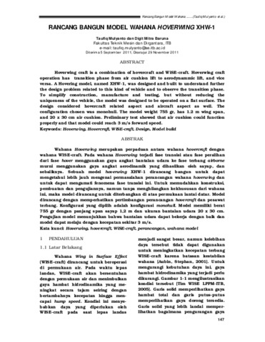 Wahana Hoverwing merupakan perpaduan antara wahana hovercraft dengan wahana WISE -craft. Pada wahana Hoverwing terjadi fase transisi atau fase peralihan dari fase hover menggunakan gaya angkat bantalan udara ke fase terbang airborne murni menggunakan gaya angkat aerodinamik yang dihasilkan oleh sayap , dan sebaliknya . Sebuah model hoverwing XHW -1 dirancang bangun u ntuk dapat mengetahui lebih jauh mengenai permasalahan perancangan wahana hoverwing dan untuk dapat mengamati fenomena fase transisi ini. Untuk memudahkan konstruksi, pembuatan dan pengujiannya, namun tanpa menghilangkan kekhususan dari wahana ini, maka model dirancang untuk di terbangkan di atas permukaan lantai datar. Model dirancang dengan memperhatikan pertimbangan perancangan hovercraft dan pesawat terbang. Konfigurasi yang dipilih adalah konfigurasi monohull . Model memiliki berat 755 gr dengan panjang span sayap 1,2 m dan u kuran bantalan udara 20 x 30 cm. Pengujian model menunjukkan bahwa bantalan udara dapat bekerja dengan baik dan model dapat melaju dengan kecepatan sekitar 3 m/s.
