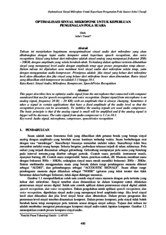 Tulisan ini menjelaskan bagaimana mengoptimalisasi sinyal audio dari mikrofone yang akan dihubungkan dengan input audio komputer untuk keperluan speech recognition, dan voice recognition. Sinyal yang keluar dari mikrofone adalah sinyal analog yang mempunyai frekuensi 20Hz – 20KHz dengan amplitudo yang selalu berubah-ubah. Terkadang dalam aplikasi tertentu dibutuhkan sinyal yang mempunyai level audio dengan amplitudo tetap agar proses pengenalan tetap akurat . Dalam tulisan ini dijelaskan cara membuat level sinyal audio dari mikrofone selalu tetap, yaitu dengan menggunakan audio kompressor. Prinsipnya adalah jika sinyal yang keluar dari mikrofone kecil akan dikuatkan dan jika sinyal yang keluar dari mikrofone besar akan diturunkan. Rasio sinyal yang dihasilkan oleh kompressor ini adalah 1:1 hingga 10:1.