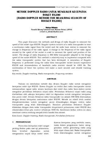 Tulisan ini membahas metode dan desain Doppler radio untuk mengukur kecepatan roket tipe RX200. Sistem Doppler ini terdiri dari radio transponder untuk memancarkan signal radio secara kontinyu dari roket dan radio base-station untuk mengukur perubahan frekuensi sinyal radio. Perubahan frekuensi sinyal radio yang disebabkan oleh adanya kecepatan roket ini digunakan untuk mengukur kecepatan dan posisi roket. Desain frekuensi radio transponder ini adalah 880 MHz disesuaikan dengan desain kecepatan maksimum roket RX200. Metode ini relatif lebih mudah diimplementasikan untuk mengukur posisi dibandingkan dengan sistem radar transponder yang telah dikembangkan. Simulasi perubahan frekuensi Doppler dilakukan dengan data radar transponder eksperiment peluncuran roket RX200 dan rekomendasi lebar-pita receiver sebaiknya 4000 Hz. Kombinasi kedua sistem ini akan membuat sistem tracking menjadi lebih handal dan akurat.