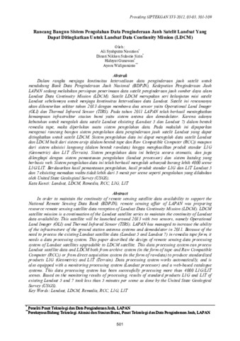 Dalam rangka menjaga kontinuitas ketersediaan data penginderaan jauh satelit untuk mendukung Bank Data Penginderaan Jauh Nasional (BDPJN), Kedeputian Penginderaan Jauh LAPAN sedang melakukan persiapan penerimaan data satelit penginderaan jauh sumber daya alam Landsat Data Continuity Mission (LDCM). Satelit LDCM merupakan seri kelanjutan misi satelit Landsat sebelumnya untuk menjaga kontinuitas ketersediaan data Landsat. Satelit ini rencananya akan diluncurkan sekitar tahun 2013 dengan membawa dua sensor yaitu Operational Land Imager (OLI) dan Thermal Infrared Sensor (TIRS). Pada tahun 2011 LAPAN telah berhasil meningkatkan kemampuan infrastruktur stasiun bumi yaitu sistem antena dan demodulator. Karena adanya kebutuhan untuk mengolah data satelit Landsat eksisting (Landsat 5 dan Landsat 7) dalam bentuk remedia tape, maka diperlukan suatu sistem pengolahan data. Pada makalah ini dipaparkan mengenai rancang bangun sistem pengolahan data penginderaan jauh satelit Landsat yang dapat ditingkatkan untuk satelit LDCM. Sistem pengolahan data ini dapat mengolah data satelit Landsat dan LDCM baik dari sistem arsip (dalam bentuk tape dan Raw Compatible Computer (RCC)) maupun dari sistem akuisisi langsung (dalam bentuk rawdata) hingga menghasilkan produk standar L1G (Geometric) dan L1T (Terrain). Sistem pengolahan data ini bekerja secara otomatis, dan juga dilengkapi dengan sistem pemantauan pengolahan (landsat processor) dan sistem katalog yang berbasis web. Sistem pengolahan data ini telah berhasil mengolah sebanyak kurang lebih 4000 scene L1G/L1T. Berdasarkan hasil pemantauan pengolahan, hasil produk standar L1G dan L1T Landsat 5 dan 7 eksisting memakan waktu tidak lebih dari 5 menit per scene seperti pengolahan yang dilakukan oleh United State Geological Survey (USGS).