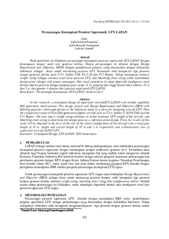 Pada penelitian ini dilakukan perancangan konseptual pesawat supersonik LFX LAPAN dengan kemampuan tempur multi misi generasi kelima. Dalam perancangan ini dimulai dengan Design Requirement dan Objective (DRO) dengan pendefinisan purpose yang disesuaikan dengan kebutuhan Indonesia sebagai dasar untuk merancang pesawat LFX. Kemudian studi komparasi tiga pesawat tempur generasi kelima yaitu F-35, Sukhoi FAK PA T-50 dan F22 Raptor. Tahap selanjutnya estimasi weight sizing sebagai estimasi awal berat pesawat LFX, dan Matching chart sizing untuk menentukan design point sebagai titik acuan rancangan. Dari hasil penelitian ini akan diperoleh konfigurasi awal berupa ukuran pesawat dengan panjang span sayap 14 m, panjang dan tinggi keseluruhan sebesar 19 m dan 5 m. dan gambar 3 dimensi dari pesawat supersonik LFX LAPAN.