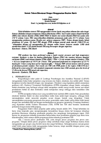 Telah dilakukan sintesis TDI menggunakan reactor batch yang tahan tekanan dan suhu tinggi. Sintesis dilakukan dengan pemanasan Toluen dikarbamat (TDC) hasil reaksi antara dimetil karbonat (DMC) dan toluene diamine (TDA) (DMC/TDA=3) katalis zinc asetat (Katalis/TDA=0,2) pada suhu 170 oC selama 3 jam. TDC yang dihasilkan dilakukan pemanasan pada suhu 225 oC selama 3 jam menggunakan pembawa panas Parafin cair, pelarut campuran THF+ Toluen dengan katalis bubuk aluminium 0,5 gram. Uji hasil TDI dengan FTIR terdapat puncak pada daerah 2100-2270 cm- 1 dilanjutkan dengan uji menggunakan GC dengan waktu retensi senyawa standar 5,905 detik memberikan kadar 17,6% dalam bentuk TDI yang bercampur dengan impuritas.