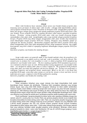 Motor roket berukuran besar umumnya dibuat secara case bonded dimana propelan akan terpasang secara permanen di dalam motor roket tersebut sehingga tidak diperbolehkan adanya cacat propelan terutama keropos (voids). Penelitian ini bertujuan untuk menghasilkan propelan agar bebas dari keropos sebagai upaya memperoleh metode pembuatan propelan D550 untuk motor roket case bonded. Proses propelan D550 free standing dievaluasi untuk mencari penyebab terjadinya keropos. Peralatan casting propelan D550 untuk motor roket case bonded dirancang dengan menambahkan slitter plate untuk menghilangkan udara yang terjebak sebagai penyebab terjadinya keropos. Propelan D550 yang dibuat dengan menggunakan slitter plate tersebut diuji kualitasnya untuk dibandingkan dengan propelan D550 free standing. Pengujian yang dilakukan adalah uji radiografi dan densitas propelan. Berdasarkan pengujian diperoleh bahwa propelan D550 yang dibuat menggunakan slitter plate tidak mengandung keropos tetapi mempunyai densitas dan tingkat keseragaman yang lebih rendah di sepanjang bagiannya dibandingkan dengan propelan D550 free standing.