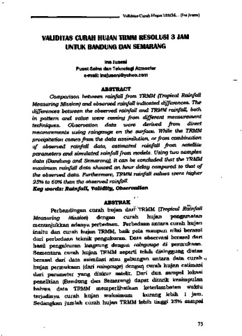 Perbandingan curah hujan dari TRMM (Tropical Rainfall Measuring Mission) dengan curah hujan pengamatan menunjukkan adanya perbedaan. Perbedaan antara curah hujan insitu dan curah hujan TRMM, baik pola maupun nilai berasal dari perbedaan teknik pengukuran. Data observasi berasal dari hasil pengukuran langsung dengan raingauge di permukaan. Sementara curah hujan TRMM seperti telah disinggung diatas berasal dari data asimilasi atau gabungan antara data curah tt, hujan permukaan (dari raingauge) dengan curah hujan estimasi dari parameter yang diukur satelit. Dori dua sampel lokasi penelitian (Bandung dan Semarang) dapat ditarik kesimpulan bahwa data TRMM memperlihatkan keterlambatan waktu terjadinya curah hujan maksimum kurang lebih 1 jam. Sedangkan jumlah curah hujan TRMM lebih tinggi 25% sampai 60% dari curah hujan observasi