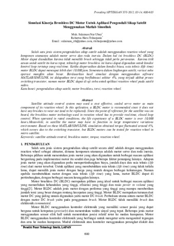 Salah satu jenis sistem pengendalian sikap satelit adalah menggunakan reaction wheel yang komponen utamanya adalah motor servo dan roda inersia. Dalam hal ini brushless DC (BLDC) Motor dapat diandalkan karena tidak memiliki brush sehingga tidak perlu perawatan. Karena titik acuan untuk satelit itu harus tepat, teknologi motor brushless ini harus dapat digunakan untuk kondisi kontrol loop tertutup yang real-time. Ketika dioperasikan dalam kondisi biasa, usia teknis (life time) motor BLDC dapat mencapai lebih dari 10.000 jam. Sementara dalam lingkungan satelit, variasi suhu operasi mungkin akan besar. Berdasarkan hasil simulasi dengan menggunakan software MATLAB/SIMULINK ini didapatkan torsi yang berfluktuasi sekitar 4%, yang terjadi akibat proses switching transistor, namun motor BLDC dapat di uji coba untuk aplikasi reaction wheel pada satelit mikro.