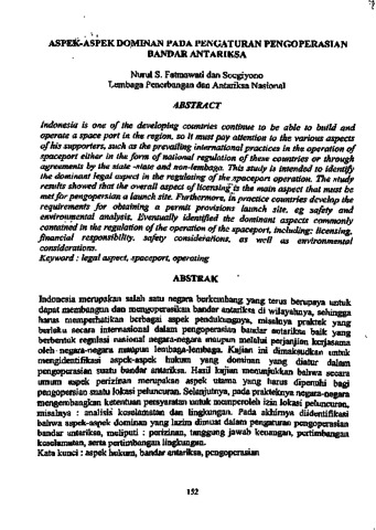 Indonesia merupakan salah satu negara berkembang yang terus berupaya untuk dapat membangun dan mengoperasikan bandar antariksa di wilayahnya, sehingga harus memperhatikan berbagai aspek pendukungnya, misalnya praktek yang berlaku secara internasional dalam pengoperasian bandar antariksa baik yang berbentuk regulasi nasional negara-negara maupun melalui perjanjian kerjasama oleh negara-negara maupun lembaga-lembaga. Kajian ini dimaksudkan untuk mengidentifikasi aspek-aspek hukum yang dominan yang diatur dalam pengoperasian suatu bandar antariksa. Hasil kajian menunjukkan bahwa secara umum aspek perizinan merupakan aspek utama yang harus dipenuhi bagi pengopersian suatu lokasi peluncuran. Selanjutnya, pada prakteknya negara-negara mengembangkan ketentuan persyaratan untuk memperoleh izin lokasi peluncuran, misalnya : analisis keselamatan dan lingkungan. Pada akhirnya diidentifikasi bahwa aspek-aspek dominan yang lazim dimuat dalam pengaturan pengoperasian bandar antariksa, meliputi : perizinan, tanggung jawab keuangan, pertimbangan keselamatan, serta pertimbangan lingkungan