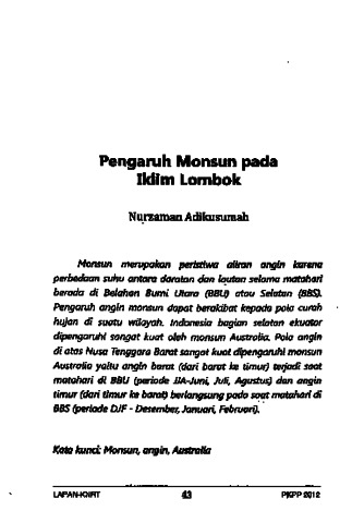 Nurzaman Adikusumah (2012) Pengaruh Monsun pada Iklim Lombok. In: Model Atmosfer untuk Pariwisata. Almatera, Jogjakarta, pp. 43-49. ISBN 978-979-16160-8-9