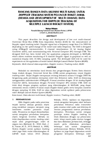 Makalah ini membahas hasil desain dan pengembangan Sistem Data Akuisisi biaya rendah dengan Universial Serial Bus (USB) untuk pengukuran sinyal Doppler tracking roket. Sinyal Doppler mempunyai rentang frekuensi antara 0 hingga 3000 Hz bergantung pada perubahan kecepatan roket dan frekuensi radio. DAS ini dirancang menggunakan mikrokontroler ATMega32, 8 kanal simultan dengan 16 bit Analog Digital Converter (ADC), komunikasi dengan Personal Computer (PC) melalui USB. DAS ini telah diuji dengan program aplikasi yang dikembangkan di MATLAB, yang dapat memantau secara realtime 8 kanal sinyal Doppler dalam grafis serta tampilan numerik dengan sampling 16 KHz. DAS ini akan digunakan untuk aplikasi pada peluncuran roket Multiple Launch Rocket System (MLRS).