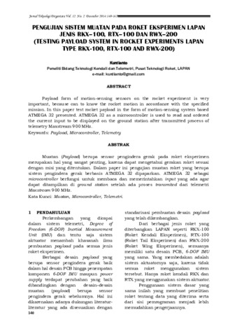 Kurdianto (2014) Pengujian Sistem Muatan Pada Roket Eksperimen Lapan Jenis RKX–100, RTX–100 Dan RWX–200. Jurnal Penginderaan Jauh dan Pengolahan Data Citra Digital, 12 (2). pp. 140-145. ISSN 1412-8098