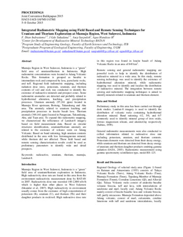 Indrastomo, Frederikus Dian and Sukadana, I Gde and Saepuloh, Asep and Handoyo, Agus (2015) Integrated Radiometric Mapping using Field Based and Remote Sensing Techniques for Uranium and Thorium Exploration at Mamuju Region, West Sulawesi, Indonesia. In: Joint Convention Balikpapan 2015 HAGI-IAGI-IAFMI-IATMI, 5–8 October 2015, Balikpapan.