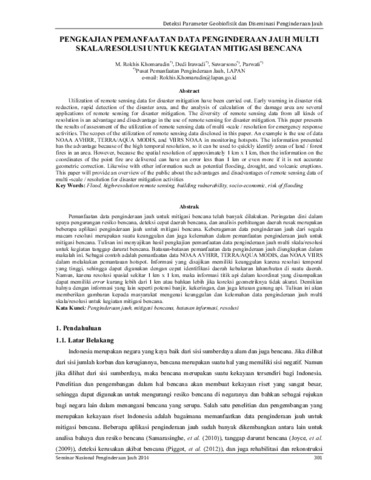Pemanfaatan data penginderaan jauh untuk mitigasi bencana telah banyak dilakukan. Peringatan dini dalam upaya pengurangan resiko bencana, deteksi cepat daerah bencana, dan analisis perhitungan daerah rusak merupakan beberapa aplikasi penginderaan jauh untuk mitigasi bencana. Keberagaman data penginderaan jauh dari segala macam resolusi merupakan suatu keunggulan dan juga kelemahan dalam pemanfaatan penginderaan jauh untuk mitigasi bencana. Tulisan ini menyajikan hasil pengkajian pemanfaatan data penginderaan jauh multi skala/resolusi untuk kegiatan tanggap darurat bencana. Batasan-batasan pemanfaatan data penginderaan jauh diungkapkan dalam makalah ini. Sebagai contoh adalah pemanfaatan data NOAA AVHRR, TERRA/AQUA MODIS, dan NOAA VIIRS dalam melakukan pemantauan hotspot. Informasi yang disajikan memiliki keunggulan karena resolusi temporal yang tinggi, sehingga dapat digunakan dengan cepat identifikasi daerah kebakaran lahan/hutan di suatu daerah. Namun, karena resolusi spasial sekitar 1 km x 1 km, maka informasi titik api dalam koordinat yang disampaikan dapat memiliki error kurang lebih dari 1 km atau bahkan lebih jika koreksi geometriknya tidak akurat. Demikian halnya dengan informasi yang lain seperti potensi banjir, kekeringan, dan juga letusan gunung api. Tulisan ini akan memberikan gambaran kepada masyarakat mengenai keunggulan dan kelemahan data penginderaan jauh multi skala/resolusi untuk kegiatan mitigasi bencana