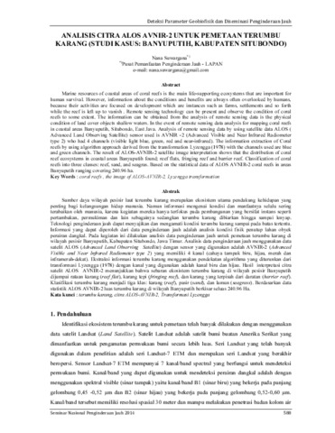 Nana Suwargana (2014) Analisis Citra ALOS AVNIR-2 untuk Pemetaan Terumbu Karang (Studi Kasus: Banyuputih, Kabupaten Situbondo). Prosiding Seminar Nasional Penginderaan Jauh 2014. pp. 588-596.