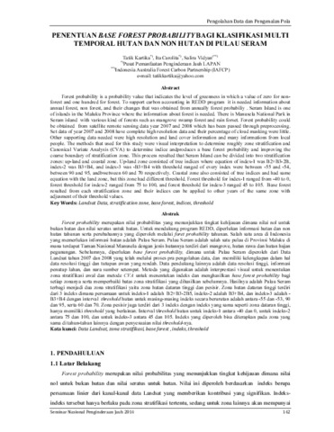 Forest probability merupakan nilai probabilitas yang menunjukkan tingkat kehijauan dimana nilai nol untuk bukan hutan dan nilai seratus untuk hutan. Untuk mendukung program REDD, diperlukan informasi hutan dan non hutan tahunan serta perubahannya yang diperoleh melalui foret probability tahunan. Salah satu area di Indonesia yang memerlukan informasi hutan adalah Pulau Seram. Pulau Seram adalah salah satu pulau di Provinsi Maluku di mana terdapat Taman Nasional Manusela dengan jenis hutannya terdiri dari mangrove, hutan rawa dan hutan hujan pegunungan. Sebelumnya, diperlukan base forest probability, dimana untuk Pulau Seram diperoleh dari Data Landsat tahun 2007 dan 2008 yang telah melalui proses pra pengolahan data, dan memiliki kelengkapan dalam hal data resolusi tinggi dan tutupan awan yang rendah. Data pendukung lainnya adalah data resolusi tinggi, informasi penutup lahan, dan nara sumber setempat. Metoda yang digunakan adalah interprestasi visual untuk menentukan zona stratifikasi awal dan metode CVA untuk menentukan indeks dan menghasilkan base forest probability bagi setiap zonanya serta memperbaiki batas zona stratifikasi yang dihasilkan sebelumnya. Hasilnya adalah Pulau Seram terbagi menjadi dua zona stratifikasi yaitu zona hutan dataran tinggi dan pesisir. Zona hutan dataran tinggi terdiri dari 3 indeks dimana persamaan untuk indeks-1 adalah B2+B3-2B5, indeks-2 adalah B3+B4, dan indeks-3 adalah - B3+B4 dengan interval threshold hutan untuk masing-masing indeks secara berurutan adalah antara -55 dan -53, 90 dan 95, serta 60 dan 70. Zona pesisir juga terdiri dari 3 indeks dengan indeks yang sama seperti zona dataran tinggi, hanya memiliki threshold yang berlainan. Interval threshold hutan untuk indeks-1 antara -40 dan 0, untuk indeks-2 antara 75 dan 100, dan untuk indeks-3 antara 45 dan 105. Indeks yang diperoleh bisa diterapkan pada zona yang sama di tahun-tahun lainnya dengan penyesuaian nilai threshold-nya