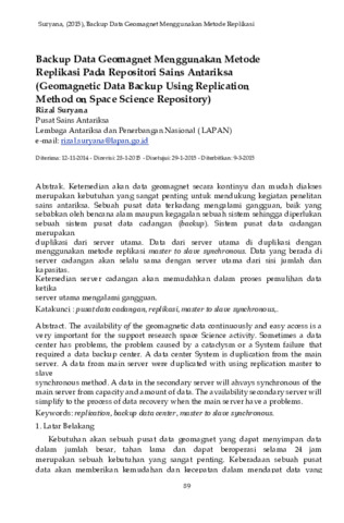 Rizal Suryana (2014) Backup Data Geomagnet Menggunakan Metode Replikasi Pada Repositori Sains Antariksa (Geomagnetic Data Backup Using Replication Method on Space Science Repository). In: Bunga Rampai Makalah Workshop: Riset Medan Magnet Bumi dan Aplikasinya Tahun 2014. C.V. Indira, Bandung, pp. 89-102. ISBN 978-979-1458-85-6
