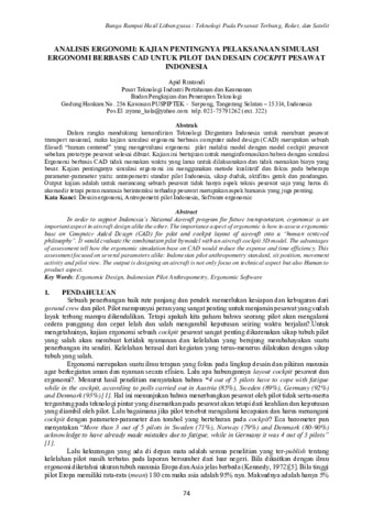 Dalam rangka mendukung kemandirian Teknologi Dirgantara Indonesia untuk membuat pesawat transport nasional, maka kajian simulasi ergonomi berbasis computer aided design (CAD) merupakan sebuah filosofi “human centered” yang mengevaluasi ergonomi pilot melalui model dengan model cockpit pesawat sebelum prototype pesawat selesai dibuat. Kajian ini bertujuan untuk menginformasikan bahwa dengan simulasi Ergonomi berbasis CAD tidak memakan waktu yang lama untuk dilaksanakan dan tidak memakan biaya yang besar. Kajian pentinganya simulasi ergonomi ini menggunakan metode kualitatif dan fokus pada beberapa parameter-parameter yaitu: antropometri standar pilot Indonesia, sikap duduk, aktifitas gerak dan pandangan. Output kajian adalah untuk merancang sebuah pesawat tidak hanya aspek teknis pesawat saja yang harus di akomodir tetapi peran manusia berinteraksi terhadap pesawat merupakan aspek humanis yang juga penting.