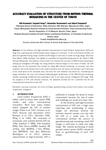 . In the airborne and high-resolution measurement of Land Surface Temperature (LST) over large area, capturing and synthesizing of many images are necessary. In the conventional method, the process of georeferencing a large number of LST images is necessary to make one large image. Structure from Motion (SfM) technique was applied to automized the georeferencing process. We called it “SfM Thermal Mosaicing”. The objective of this study is to evaluate the accuracy of SfM thermal mosaicing in making an orthogonal LST image. By using airborne thermal images in the center of Tokyo, the LST image with the 2m resolution was created by using SfM thermal mosaicing. Its accuracy was then analyzed. The result showed that in the whole examined area, the mean error distance was 4.22m and in the small parts of the examined area, the mean the error distance was about 2m. Considering the image resolution, the error was minimal indicating good performance of the SfM thermal mosaicing. Another advantage of SfM thermal mosaicing is that it can make precise orthogonal LST image. With the progress of UAV and thermal cameras, the proposed method will be a powerful tool for the environmental researches on the LST.