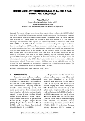 Atriyon Julzarika (2015) Height Model Integration using ALOS PALSAR, X SAR, SRTM C, AND ICESAT/GLAS. International Journal of Remote Sensing and Earth Sciences, 12 (2). pp. 107-116. ISSN 0216-6739