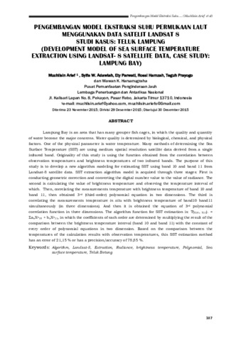 Teluk Lampung merupakan daerah yang banyak memiliki keramba ikan kerapu, yang mana kualitas dan kuantitas airnya menjadi perhatian utama. Kualitas air ditentukan oleh faktor biologi, kimia, dan fisika. Salah satu parameter fisik adalah temperatur/suhu air. Banyak metode penentuan Suhu Permukaan Laut (SPL) menggunakan data satelit resolusi spasial menengah yang diturunkan dari satu band infra merah. Originality dari penelitian ini menggunakan fungsi yang diperoleh dari hasil korelasi antara temperatur pengamatan dengan temperatur kecerahan dari dua band infra merah. Tujuan penelitian ini adalah untuk mengembangkan pemodelan algoritma baru guna mengestimasi SPL menggunakan band 10 dan band 11 dari data satelit Landsat-8. Algoritma model ekstraksi SPL diperoleh melalui 3 tahapan, yaitu: Pertama melakukan koreksi geometrik dan mengkonversi nilai digital number ke nilai radiansi. Kedua adalah menghitung nilai temperatur kecerahan serta mengamati inteval temperaturnya. Kemudian mengkorelasikan temperatur pengukuran dengan temperatur kecerahan dari band 10 dan band 11, maka diperoleh persamaan polinomial orde 3 dalam 2 dimensi. Ketiga mengkorelasikan temperatur pengamatan in situ dengan temperatur kecerahan dari band 10 dan band 11 secara bersamaan (dalam 3 dimensi). maka diperoleh persamaan fungsi korelasi polinomial orde 3 dalam 3 dimensi. Fungsi untuk estimasi SPL adalah: T(X10,X11).= ∑anXn10+bnXn11, yang mana koefisien/konstanta dari setiap orde ditentukan dari perkalian antara hasil perbandingan interval temperatur kecerahan (band 10 dan band 11) dengan konstanta setiap orde dari persamaan polinomial dalam 2 dimensi. Berdasarkan perbandingan antara temperatur hasil perhitungan dengan temperatur pengamatan, model estimasi SPL ini mempunyai kesalahan (RMSE) sebesar 21,15 % atau mempunyai ketelitian/akurasi sebesar 78,85 %.