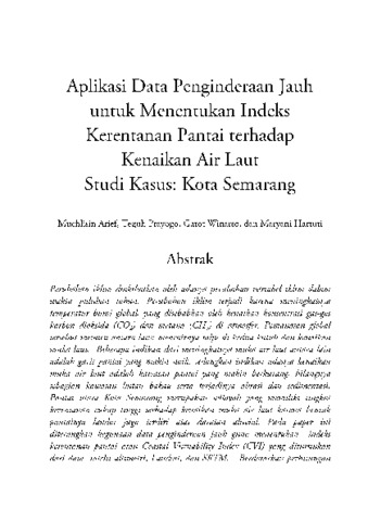 Perubahan iklim diakibatkan oleh adanya perubahan variabel iklim dalam waktu puluhan tahun. Perubahan iklim terjadi karena meningkatnya temperatur bumi global, yang disebabkan oleh kenaikan konsentrasi gas-gas karbon dioksida (CO2) dan metana (CH4) di atmosfer. Pemanasan global tersebut memicu antara lain: mencairnya salju di kedua kutub dan kenaikan muka laut. Beberapa indikasi dari meningkatnya muka air laut antara lain adalah garis pantai yang makin naik, sedangkan indikasi adanya kenaikan muka air laut adalah kawasan pantai yang makin berkurang, hilangnya sebagian kawasan hutan bakau serta terjadinya abrasi dan sedimentasi. Pantai utara Kota Semarang merupakan wilayah yang memiliki tingkat kerentanan cukup tinggi terhadap kenaikan muka air laut karena bentuk pantainya landai juga terdiri atas daratan aluvial. Pada paper ini diterangkan kegunaan data penginderaan jauh guna menentukan indeks kerentanan pantai atau Coastal Vurnability Index (CVI) yang diturunkan dari data satelit altimetri, Landsat, dan SRTM. Berdasarkan perhitungan dan data satelit altimetry, kenaikan muka air laut selaa 7 tahun adalah 70mm atau sebesar 10 mm/tahun, sedangkan bedasarkan perhitungan dari CVI menggunakan data satelit Landsat, wilayah yang sangat rentan terhadap enaikan air laut di Kota Semarang yaitu Kecamatan Tugu dan Kecamatan Genuk.
