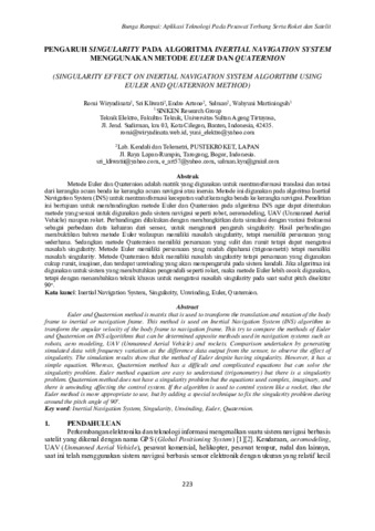 Romi Wiryadinata and Sri Kliwati and Endro Artono and Salman and Wahyuni Martiningsih (2015) Pengaruh Singularity pada Algoritma Inertial Navigation System menggunakan Metode Euler dan Quaternion. In: Bunga Rampai Hasil Litbangyasa : Teknologi Pada Pesawat Terbang, Roket, dan Satelit Th 2015. Indonesia Book Project/ Media Kita Group anggota IKAPI, Jakarta, pp. 223-229. ISBN 978-602-70353-8-6 I