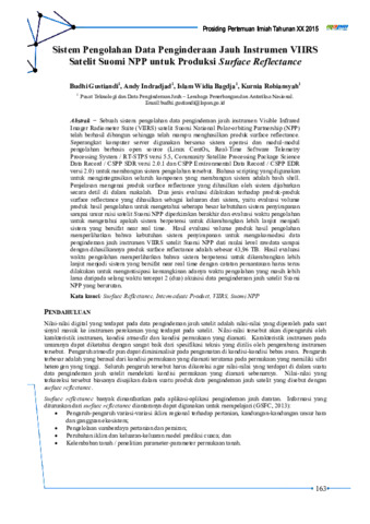 Sebuah sistem pengolahan data penginderaan jauh instrumen Visible Infrared Imager Radiometer Suite (VIIRS) satelit Suomi National Polar-orbiting Partnership (NPP) telah berhasil dibangun sehingga telah mampu menghasilkan produk surface reflectance. Seperangkat komputer server digunakan bersama sistem operasi dan modul-modul pengolahan berbasis open source (Linux CentOs, Real-Time Software Telemetry