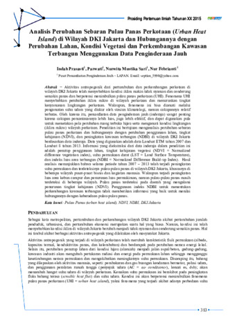 Indah Prasasti and Parwati and Nurwita Mustika Sari and Nur Febrianti (2015) Analisis Perubahan Sebaran Pulau Panas Perkotaan (Urban Heat Island) di Wilayah DKI Jakarta dan Hubungannya dengan Perubahan Lahan, Kondisi Vegetasi dan Perkembangan Kawasan Terbangun Menggunakan Data Penginderaan Jauh. Prosiding Pertemuan Ilmiah Tahunan XX dan Kongres VI Masyarakat Ahli Penginderaan Jauh Indonesia (MAPIN). pp. 383-391.