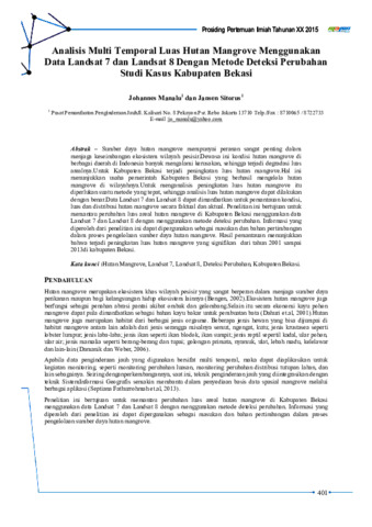 Johannes Manalu and Jansen Sitorus (2015) Analisis Multi Temporal Luas Hutan Mangrove Menggunakan Data Landsat 7 dan Landsat 8 dengan Metode Deteksi Perubahan Studi Kasus Kabupaten Bekasi. Prosiding Pertemuan Ilmiah Tahunan XX dan Kongres VI Masyarakat Ahli Penginderaan Jauh Indonesia (MAPIN). pp. 401-407.