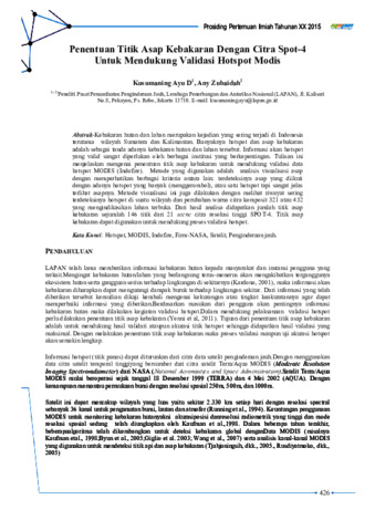 Kusumaning Ayu DS and Any Zubaidah (2015) Penentuan Titik Asap Kebakaran dengan Citra Spot-4 untuk Mendukung Validasi Hotspot Modis. Prosiding Pertemuan Ilmiah Tahunan XX dan Kongres VI Masyarakat Ahli Penginderaan Jauh Indonesia (MAPIN). pp. 426-432. (Unpublished)