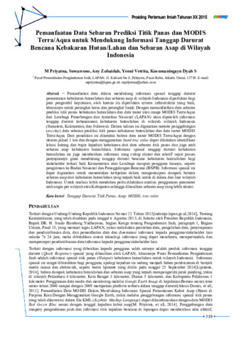 M Priyatna and Suwarsono and Any Zubaidah and Yenni Vetrita and Kusumaningayu Dyah S (2015) Pemanfaatan Data Sebaran Prediksi Titik Panas dan MODIS Terra/Aqua untuk Mendukung Informasi Tanggap Darurat Bencana Kebakaran Hutan/Lahan dan Sebaran Asap di Wilayah Indonesia. Prosiding Pertemuan Ilmiah Tahunan XX dan Kongres VI Masyarakat Ahli Penginderaan Jauh Indonesia (MAPIN). pp. 519-526.