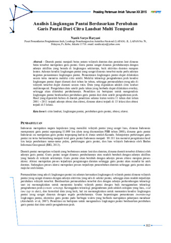 Nanik Suryo Haryani (2015) Analisis Lingkungan Pantai Berdasarkan Perubahan Garis Pantai dari Citra Landsat Multi Temporal. Prosiding Pertemuan Ilmiah Tahunan XX dan Kongres VI Masyarakat Ahli Penginderaan Jauh Indonesia (MAPIN). pp. 583-590.