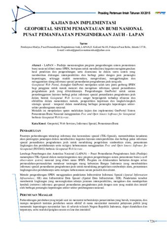 bagi pengguna untuk masuk mencari dan mengakses informasi spasial pemanfaatan penginderaan jauh yang dibutuhkannya. Pengembangan GeoPortal untuk sarana penyelenggaraan layanan berbagi pakai informasi spasial pemanfaatan penginderaan jauh dalam bentuk Geospatial Web Services sangat berpengaruh terhadap efisiensi dan efektifitas dalam menentukan metode, pengambilan keputusan dan langkah-langkah strategis spasial - temporal dalam mendukung berbagai pemangku kepentingan sektor�sektor pembangunan nasional. Makalah ini menjelaskan upaya melakukan kajian dan implementasi GeoPortal Sistem Pemantauan Bumi Nasional menggunakan Free and Open Source Software for Geospatial