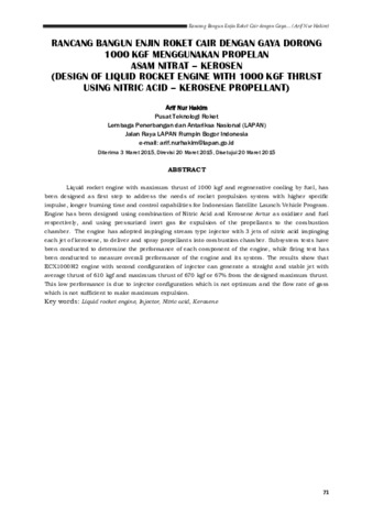 Arif Nur Hakim (2015) Rancang Bangun Enjin Roket Cair Dengan Gaya Dorong 1000 KGF Menggunakan Propelan Asam Nitrat – Kerosen. Jurnal Penginderaan Jauh dan Pengolahan Data Citra Digital, 13 (1). pp. 71-86. ISSN 1412-8098