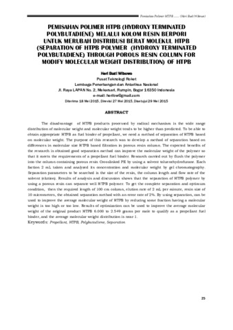 Produk HTPB yang diproses secara radikal memiliki kelemahan distribusi berat molekul yang lebar dan berat molekulnya cenderung lebih tinggi dari prediksi. Untuk dapat memperoleh HTPB yang sesuai untuk fuel binder propelan, maka diperlukan suatu metode pemisahan HTPB berdasarkan berat molekulnya. Tujuan penelitian ini adalah mengembangkan metode pemisahan HTPB berdasarkan perbedaan ukuran molekul berdasar filtrasi dalam kolom rersin berpori. Manfaat penelitian yang diharapkan adalah diperoleh metode pemisahan yang baik untuk dapat memperbaiki berat molekul polimer sehingga memenuhi persyaratan fuel binder propelan. Penelitian dilakukan dengan mengalirkan polimer ke dalam kolom berisi resin berpori “Crosslinked PE” dengan menggunakan pelarut toluenhidrofuran, kemudian setiap fraksi 2 mL diambil dan dianalisis konsentrasi dan berat molekulnya dengan kromatografi gel. Parameter pemisahan yang akan dicari adalah ukuran resin, panjang kolom, dan kecepatan alir pelarut (elusi). Hasil analisis dan pembahasan menunjukkan bahwa pemisahan polimer HTPB dengan menggunakan resin berpori dapat memisahkan polimer HTPB dengan baik. Untuk mendapatkan hasil pemisahan yang sempurna, maka dibutuhkan panjang kolom 100 cm, kecepatan elusi 2 mL per menit, resin ukuran 10 mikrometer, maka diperoleh metode pemisahan dengan tingkat kesalahan 2%. Dengan menggunakan metode pemisahan, dapat digunakan untuk memperbaiki berat molekul rata-rata HTPB dengan mengurangi beberapa fraksi yang memiliki berat molekul terlalu tinggi atau terlalu rendah. Hasil optimasi dapat digunakan untuk memperbaiki berat molekul rata-rata produk HTPB yang semula 6.000 menjadi 2.549 gr per mol sehingga memenuhi persyaratan sebagai fuel binder propelan, dan distribusi berat molekul rata-rata mendekati satu.