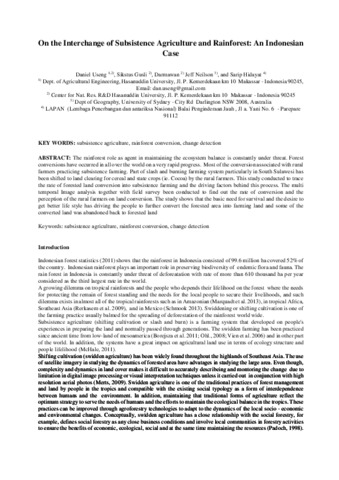 Daniel Useng and Sikstus Gusli, Darmawan and Jeff Neilson and Sarip Hidayat (2015) On the Interchange of Subsistence Agriculture and Rainforest: An Indonesian Case. Proceedings The 36th Asian Conference on Remote Sensing (ACRS) 2015. pp. 1-5.
