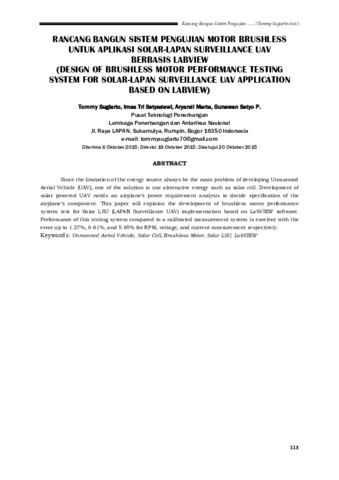 Tantangan terbesar dalam pengembangan pesawat tanpa awak adalah keterbatasan energi. Salah satu solusi masalah tersebut adalah dengan menggunakan energi alternatif diantaranya sel surya. Aplikasi pesawat tanpa awak dengan sel surya membutuhkan analisa perhitungan kebutuhan daya pesawat saat terbang, analisa tersebut akan berguna untuk menentukan spesifikasi komponen yang akan digunakan pada pesawat. Penelitian ini akan membahas rancang bangun sistem pengujian kinerja motor brushless untuk aplikasi pada Solar LAPAN Surveillance UAV (LSU) menggunakan perangkat lunak LabVIEW. Dari hasil pengujian sistem ini mampu melakukan pengukuran dengan galat sebesar 1.27%, 0.61%, dan 5.65% masing masing untuk pengukuran RPM, tegangan dan arus pada baterai.